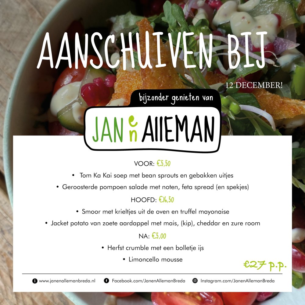 Je kunt bij ons elke eerste vrijdagavond van de maand aanschuiven tussen 17:00- 20:00. Het hele menu kost €29,- maar het is ook mogelijk de gangen los te bestellen. Reserveren kan via de telefoon 076- 7634055 of mail naar info@janenallemanbreda.nl.