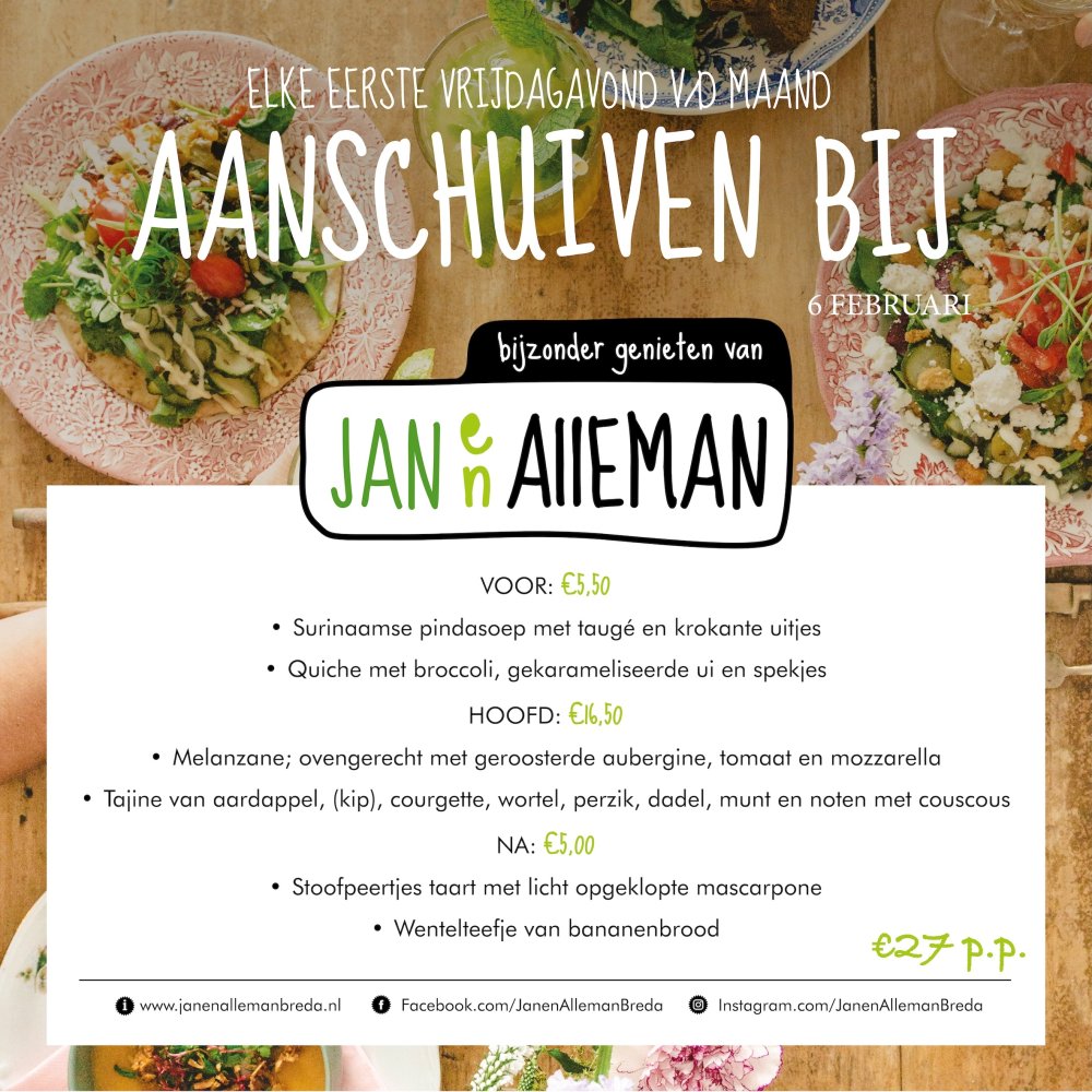 Je kunt bij ons elke eerste vrijdagavond van de maand aanschuiven vanaf 17:00 uur. (de keuken sluit rond 20:00.) Het hele menu kost €29,- maar het is ook mogelijk de gangen los te bestellen. Reserveren kan via de telefoon 076- 7634055 of mail naar info@janenallemanbreda.nl.