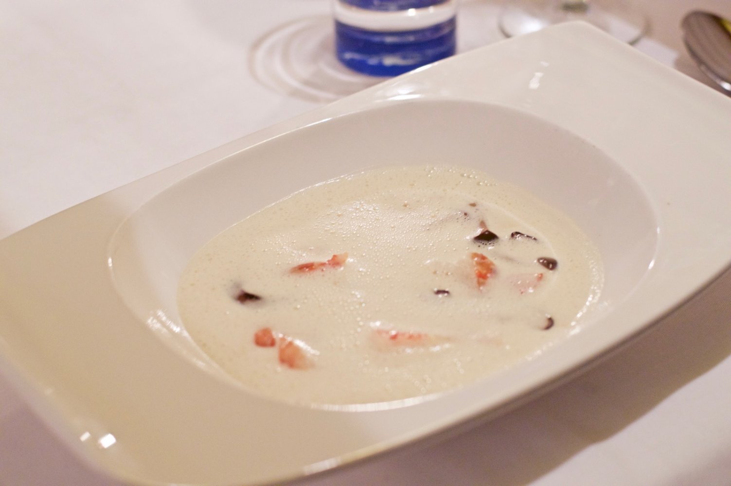 Vervolgens kwam de favoriet van de avond. Thaise kokossoep met citroengras, gember, gamba’s en shiitake. Een heerlijke romige soep bomvol authentieke Aziatische smaken. Bij dit gerecht wilde ik eigenlijk stiekem mijn bord aflikken, zo lekker was het! Uit vertrouwelijke bron heb ik begrepen dat dit ook een gewild recept is onder de gasten. Maar zoals het een echte kok betaamd kun je natuurlijk niet al je geheimen prijsgeven. Pech voor ons. Creatieve ideeën om alsnog dit recept te bemachtigen zijn welkom. Randy, je weet me te vinden! Voor degenen die Randy niet kennen, hij is de kok van Blini die al deze heerlijkheden op tafel weet te toveren samen met zijn team.
