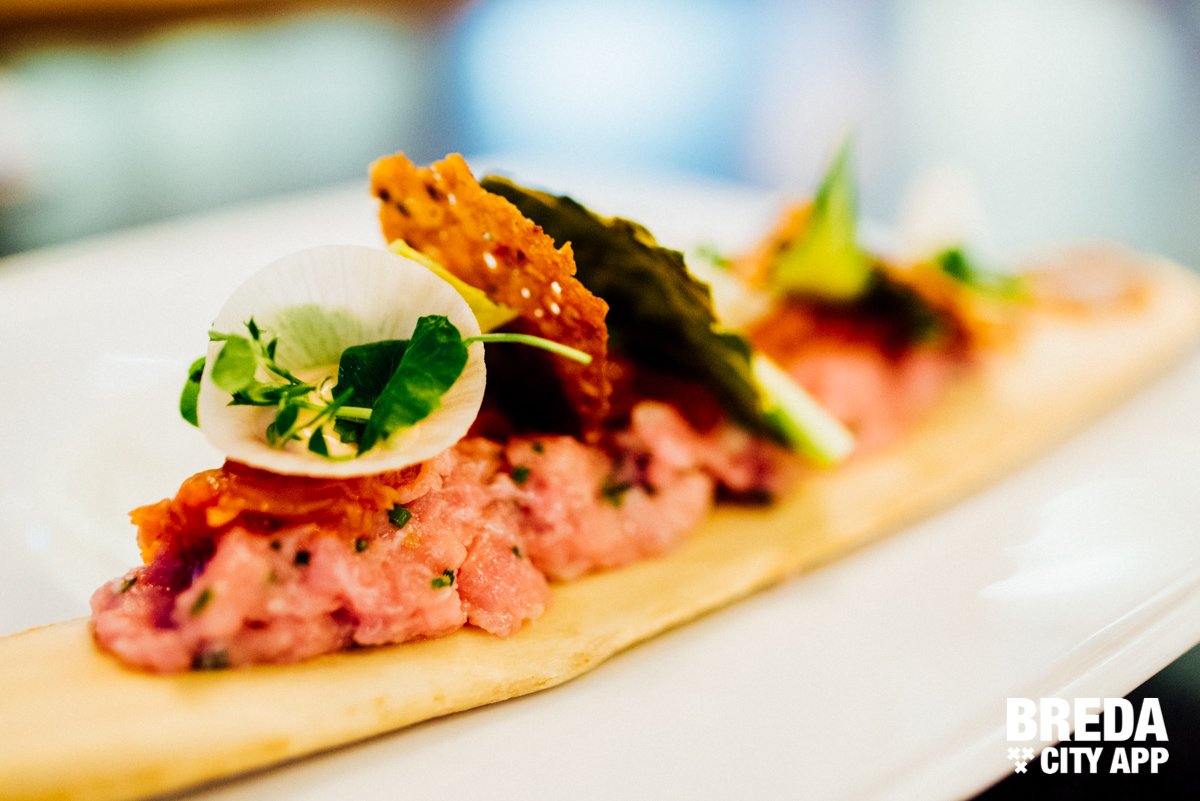 We sluiten de proeverij van voorgerechten af met een gerecht met een Aziatische touch: kalfstartaar met kimchi en Shanghai paksoi. Om het af te maken een mayonaise van miso en sesamtuille. Dit was een iets pittiger gerecht dan we verwacht hadden, maar zeker net zo lekker als de voorgaande gerechten. Het vlees is heerlijk gekruid en de verschillende garnituren maken het geheel mooi af.