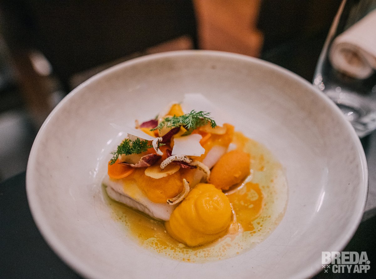 De scholfilet is langzaam gegaard op 70 graden, waardoor de structuur én de smaak van de vis precies goed zijn. Verder zien we wortel, kokos, boemboe bali, crunch van gepofte wilde rijst, vinaigrette van wortel en kokos papaya op het mooi opgemaakte bord liggen. Veel verschillende componenten, maar een hele mooie balans tussen alle smaken.