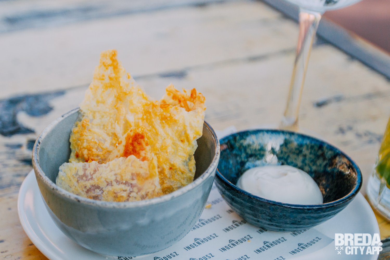 Deze binnentuin is ook waar we de avond in beginnen. We worden verwelkomt door Joshua, een vriendelijke man die duidelijk veel passie heeft voor zijn vak. Op een lounge set zijn we in de laatste zonnestraaltjes neergestreken en mogen we een keuze maken voor een cocktail van de kaart. De kaart is uitgebreid en een keuze maken is lastig, maar we nemen een Mojito en een alcoholvrije Gin-Tonic. Hierbij krijgen we een krokantje van Parmezaan met een crème gemaakt van olijven. Tussen al het groen van deze binnentuin is dit puur genieten.