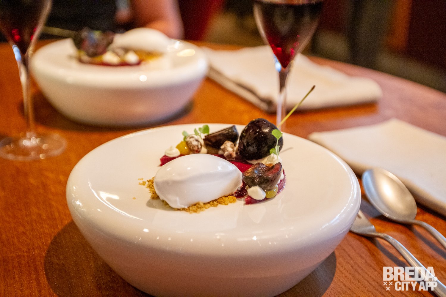 Bij de laatste gang wordt een dessertwijn uit Zuid Afrika geserveerd, namelijk een Rooi Muscadelle van Slanghoek. In deze volle en krachtige wijn proef je direct rood fruit terug en dit sluit dan weer mooi aan bij het dessert wat we erbij krijgen. Dit is een ijs van karnemelk met verschillende bereidingen van kers, waaronder gebrande kersen. De zachte smaak van het karnemelk ijs breekt de zoetigheid van de kersen en de toegevoegde noten geven het een aardse smaak. Ook dit gerecht is perfect in balans en een heerlijke afsluiter van de avond.