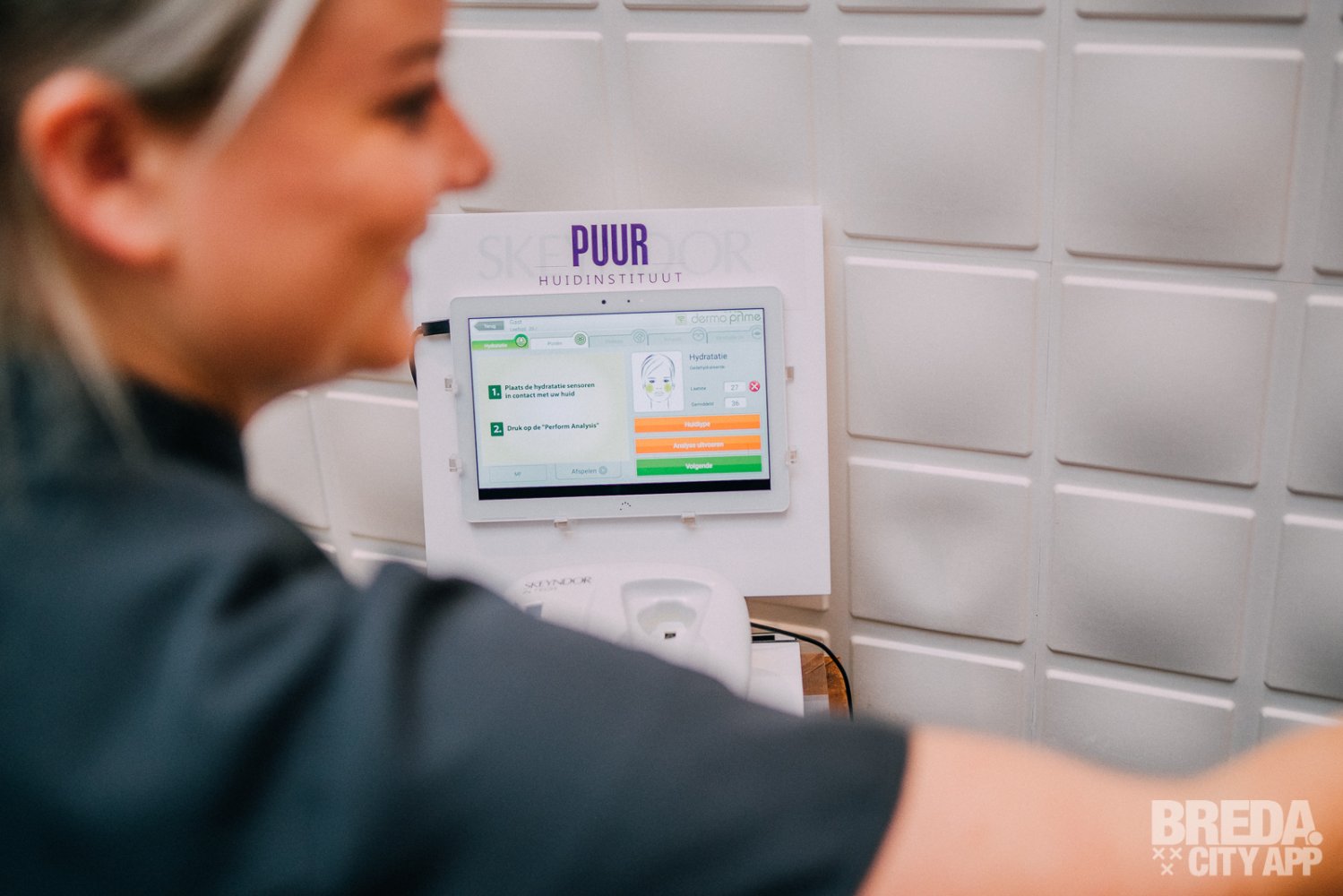 Voor dat de behandeling begint krijg ik eerst een aantal vragen over mijn medische gesteldheid. Daarna volgt een huidanalyse om te kijken naar de waardes van mijn huid. Er komen bij deze analyse verschillende onderdelen aanbod waaronder: hydratatie, poriën en fijne lijntjes. Met deze informatie over mijn huid houden ze rekening in de behandeling en geven ze persoonlijk advies om de huid in topconditie te krijgen.